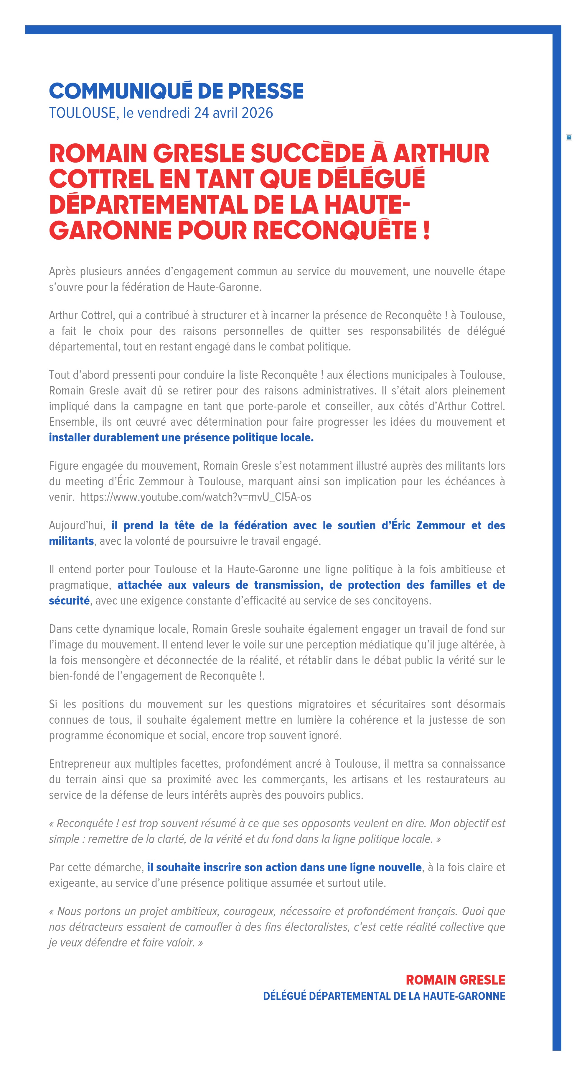 Arthur Cottrel, qui a contribué à structurer et à incarner la présence de Reconquête ! à Toulouse, a fait le choix pour des raisons personnelles de quitter ses responsabilités de délégué départemental, tout en restant engagé dans le combat politique.